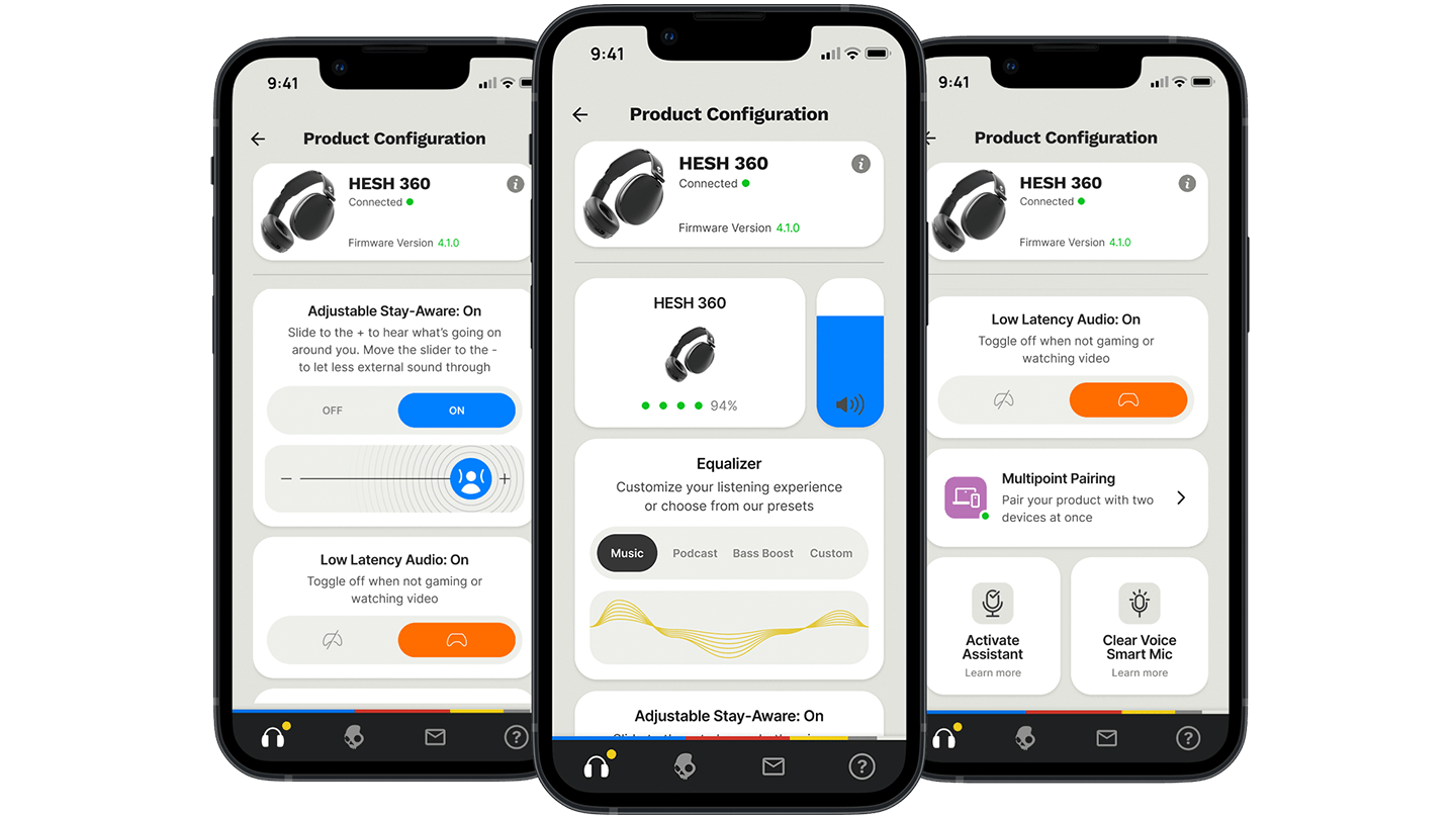 Use the Skullcandy App to unlock the full potential of Hesh 360. Customize your sound with Adjustable Stay-Aware Mode, Preset and Custom EQ profiles, Low-Latency audio and Multipoint Pairing settings.